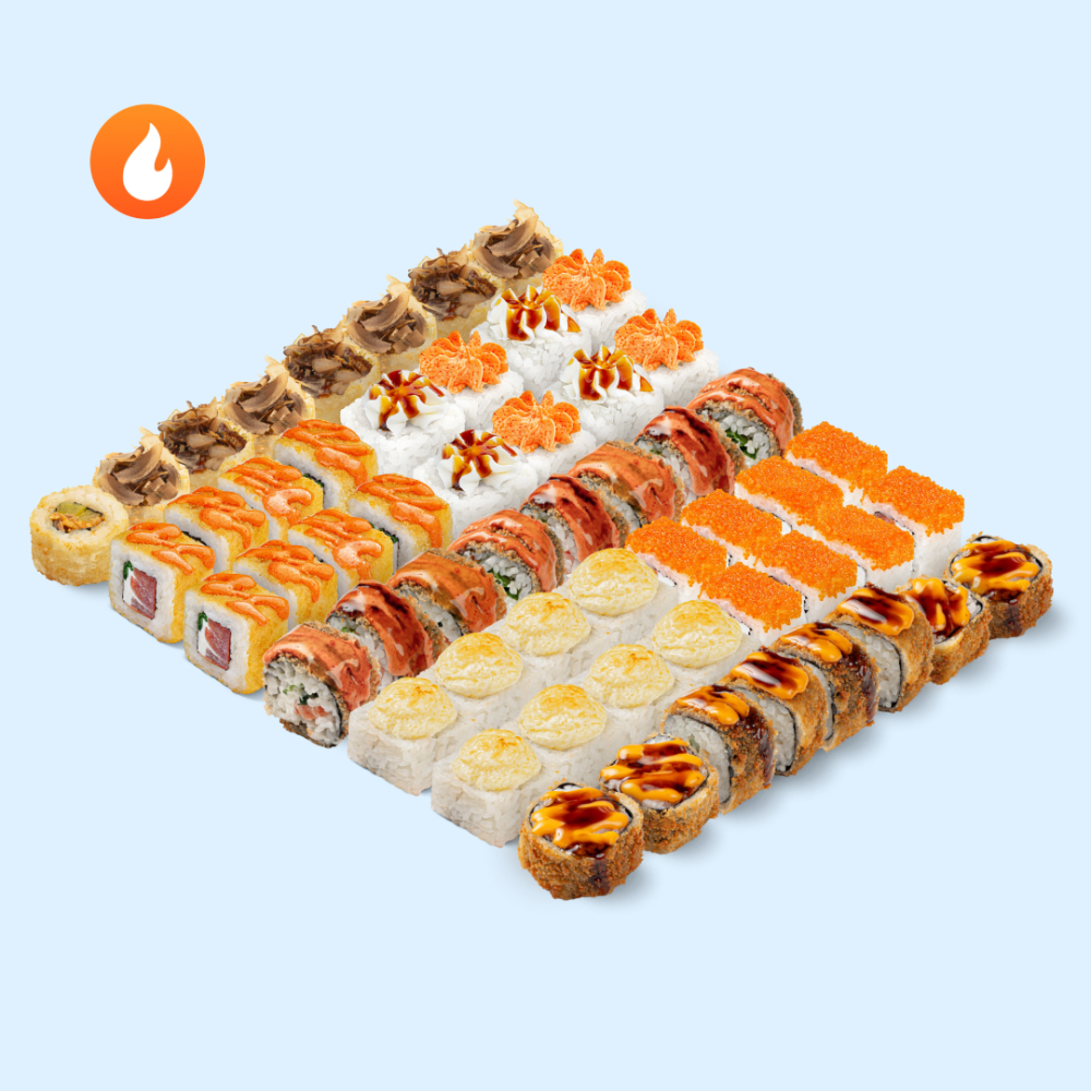 Состав: Чикен Темпура, Спейшл NEW, Горячий Лосось, Запеченный с курицей, Жареный лосось чиз, Лосось с тобико оранж, Лава Краб.