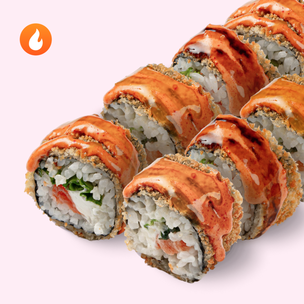 Упитанный лосось под пикантным комбо из трёх соусов рвётся к тебе на стол. Состав: нори, лосось, сыр сливочный, салат, кляр, сухари, соус спайс, соус унаги, соус чили-ананас