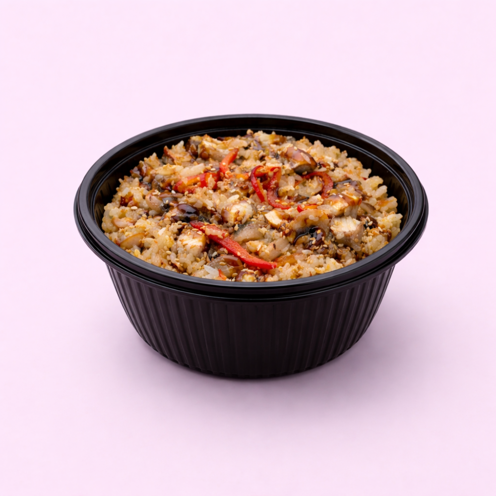Рис, угорь, перец болгарский, морковь, лук красный, чеснок, яйцо, соевый соус, мирин, кунжут белый, соус унаги