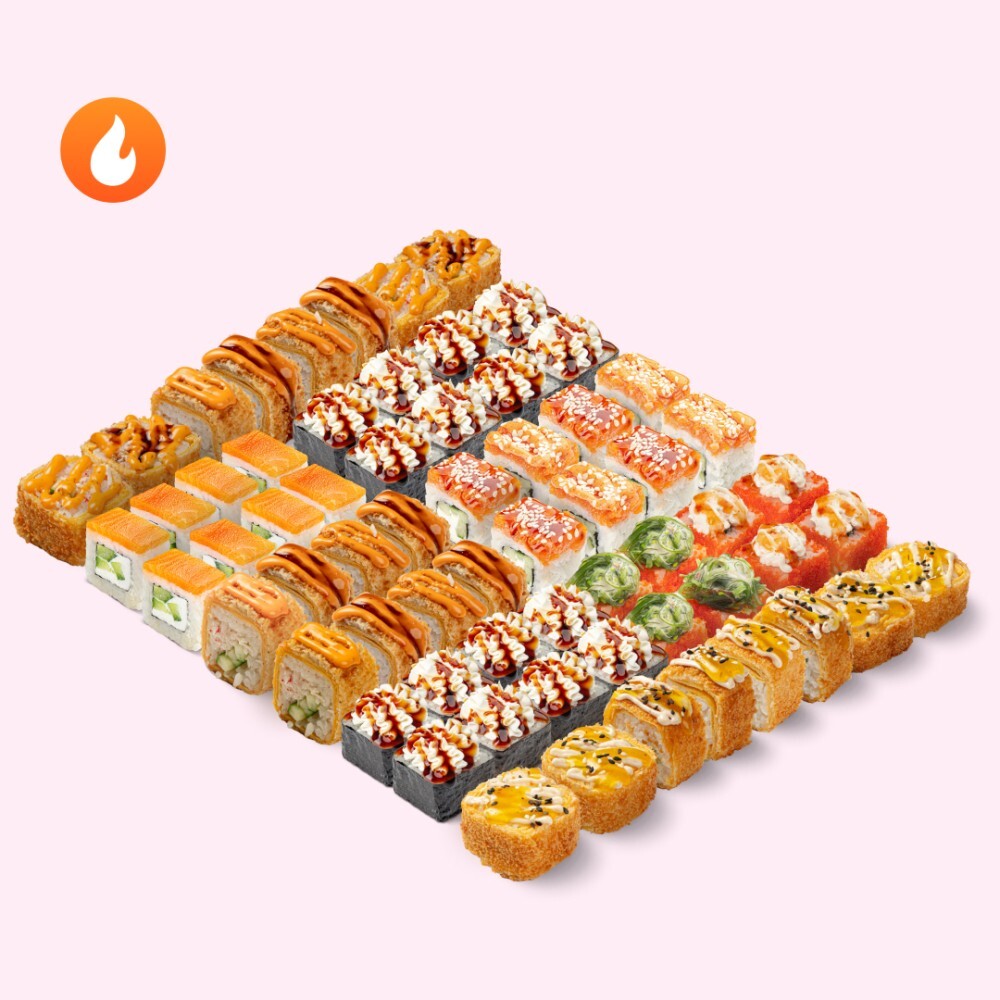 Больше роллов — меньше стресса. Возьми большой сет с крабом и лососем и устрой балийский ретрит у себя дома. Состав: Чук и чиз ролл, Краб темпура Х2, Сочный краб терияки Х2, Лосось спайс, Филадельфия лайт, Тортилья с курицей и чили-ананас