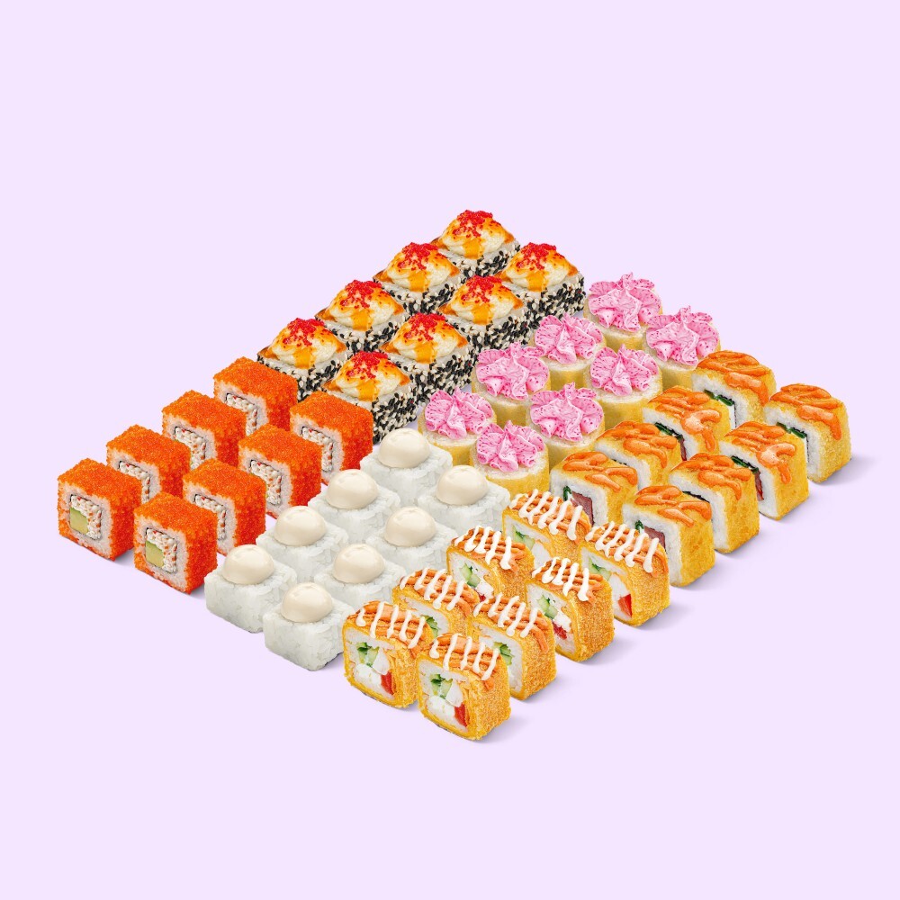 Ты ей: большой сет из 6 видов роллов с морепродуктами, рыбой и курицей. Она тебе: ой, спаси-и-ибки. Состав: Калифорния с огурцом, Лава темпура, Спейшл NEW, Запечённая филадельфия с лососем и крабом, Цезарь BIG, Цезарь