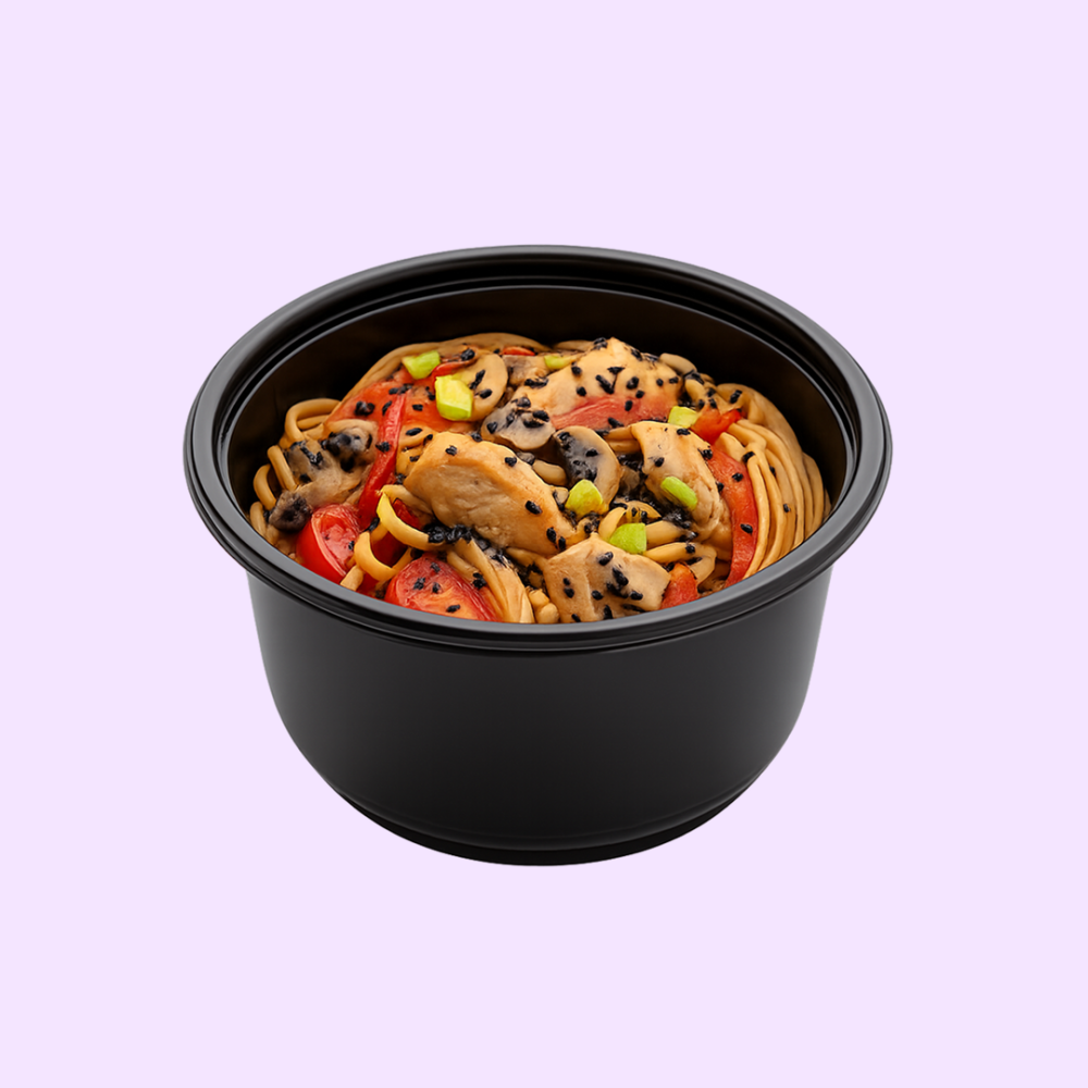 Лапша удон, филе куриное, лук зелёный, шампиньон, перец болгарский, соус пад тай, кунжут ч/б, помидоры черри